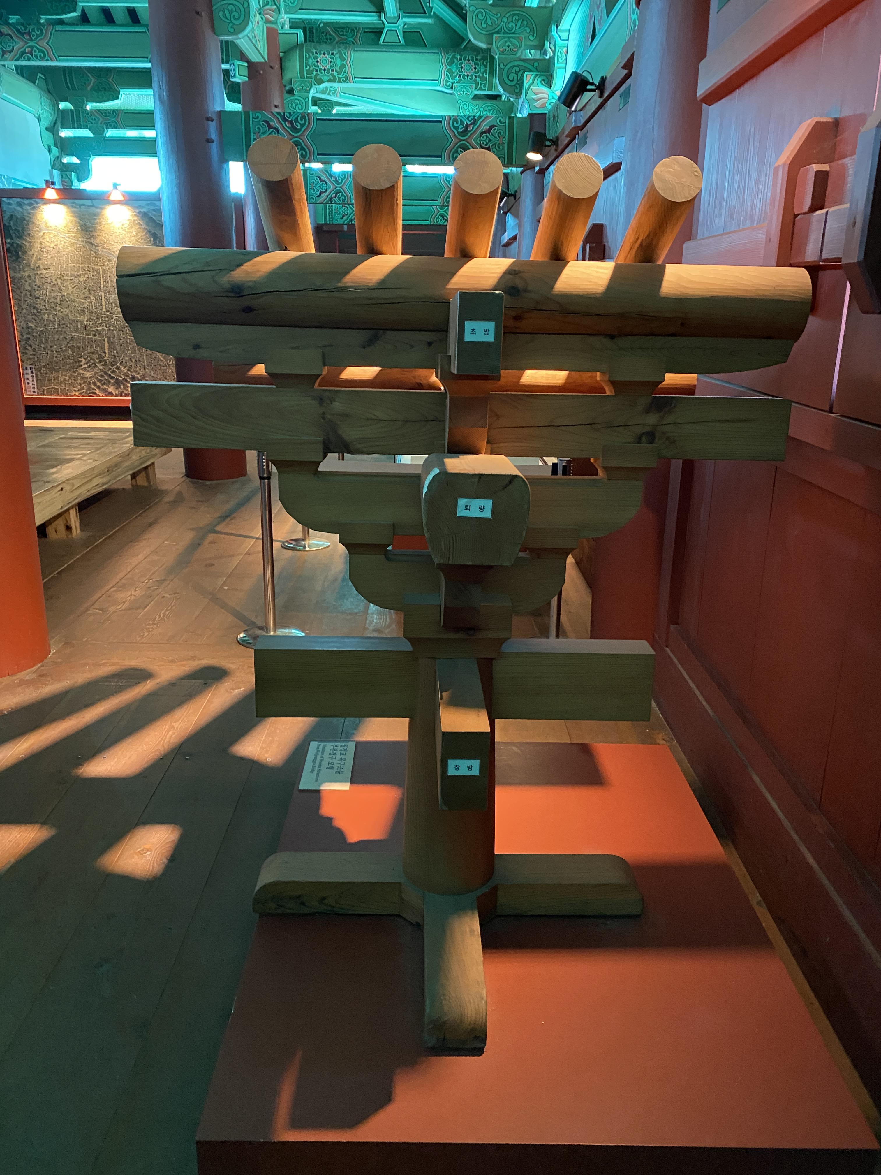 힘들게 2층을 올라가도 사실 별다른 볼거리는 없었다. 첫 번째 사진 왼쪽 귀퉁이를 보면 오래된 경주 지도가 있고, 월정교를 복원할 때 쓰인 목구조물 모형이 전시되어 있다. 영상도 틀어주는데 눈이 가지는 않더라.