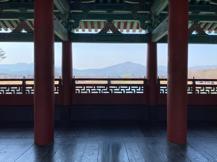 월정교 내부에서 밖을 바라보면 이런 풍경이 보인다. 시원한 바람에 밑에는 강이 흐르고 앞에는 산이 마주하니 이보다 더 좋은 그림은 어디에도 볼 수 없지만 공기 하나 때문에 그림 자체가 탁해져 버렸다.