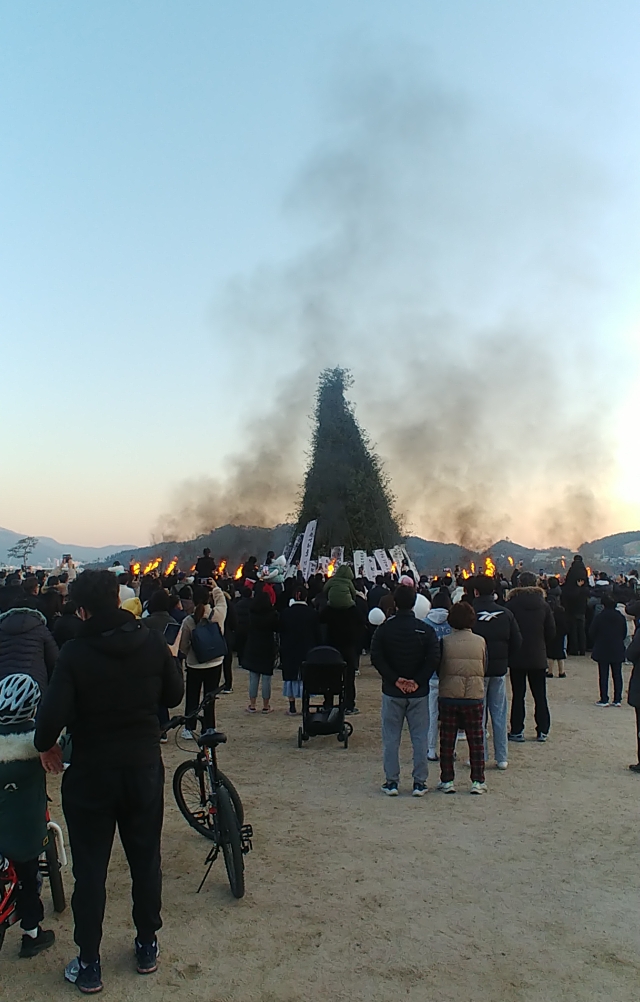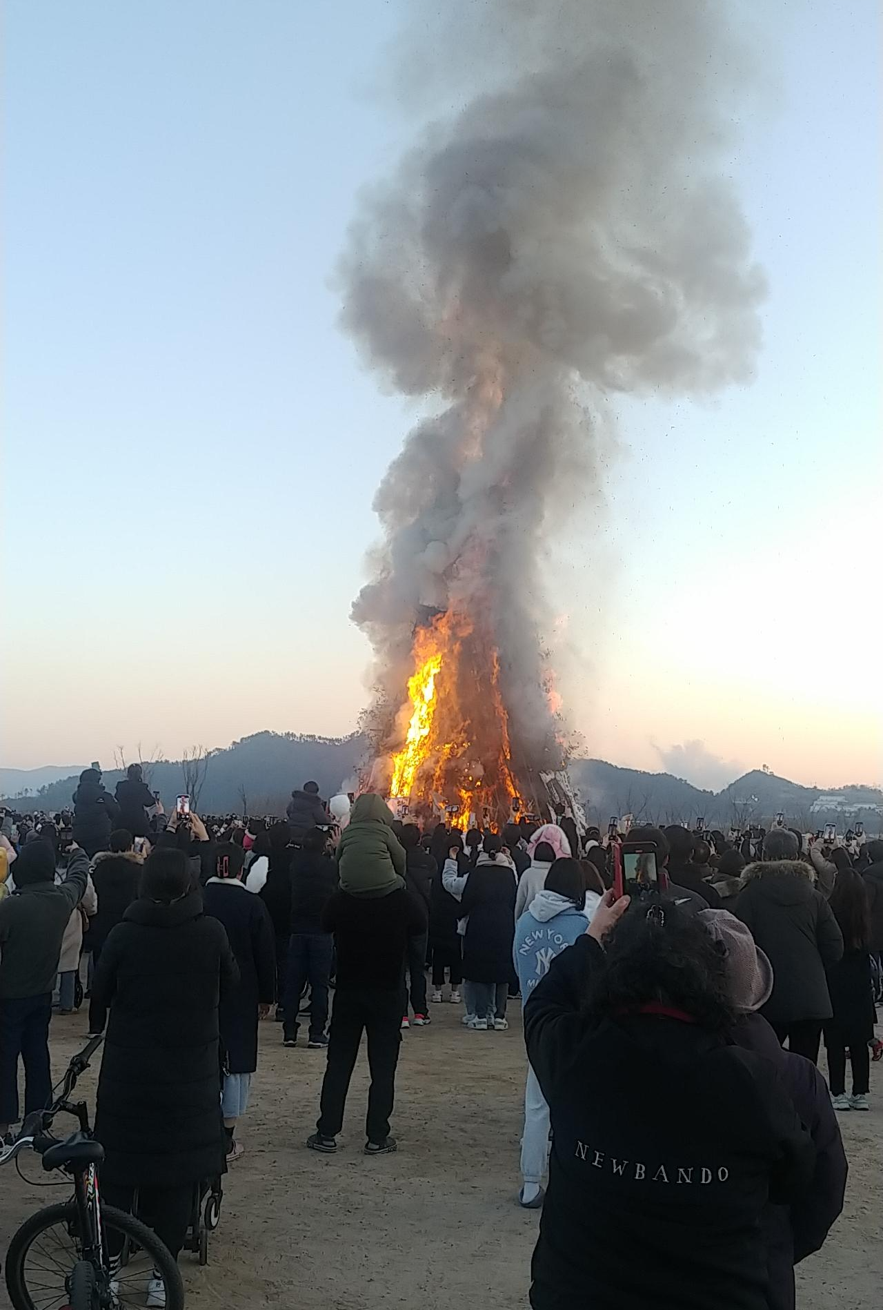 코로나로 각종 행사가 미뤄지다 드디어 3년 만에 황산공원에서 정월대보름 행사가 개채 되었습니다. 행사라고 그리 거창한 것은 아니고 약간의 술과 안주, 음료 무료 나눔과 대나무 탑 태우기가 진행되었지만 오랜만이 행사로 엄청난 인파가 모였답니다.