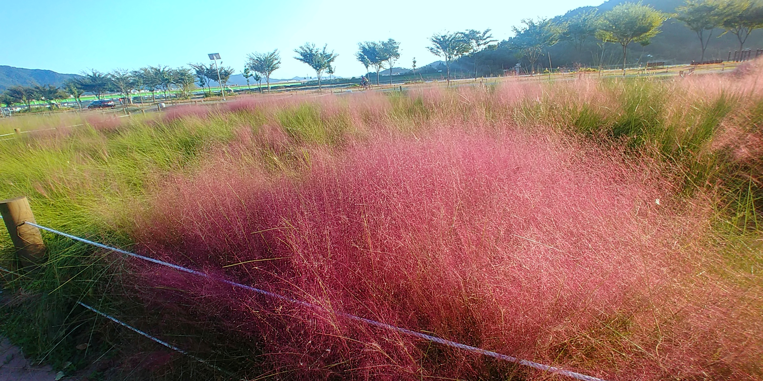 오늘 핑크뮬리 공원은 색감 자체가 짙은 핑크색으로 보이는데요. 초록색 줄기와 듬성듬성한 꽃이 멋진 조화를 이루지는 않네요. 9월부터 시작해 11월에 절정에 달하기 때문에 아직 까진 듬성듬성한 모습을 보이고 있지만 10월 말부터는 온통 연한 핑크빛 물결을 볼 수 있습니다.
