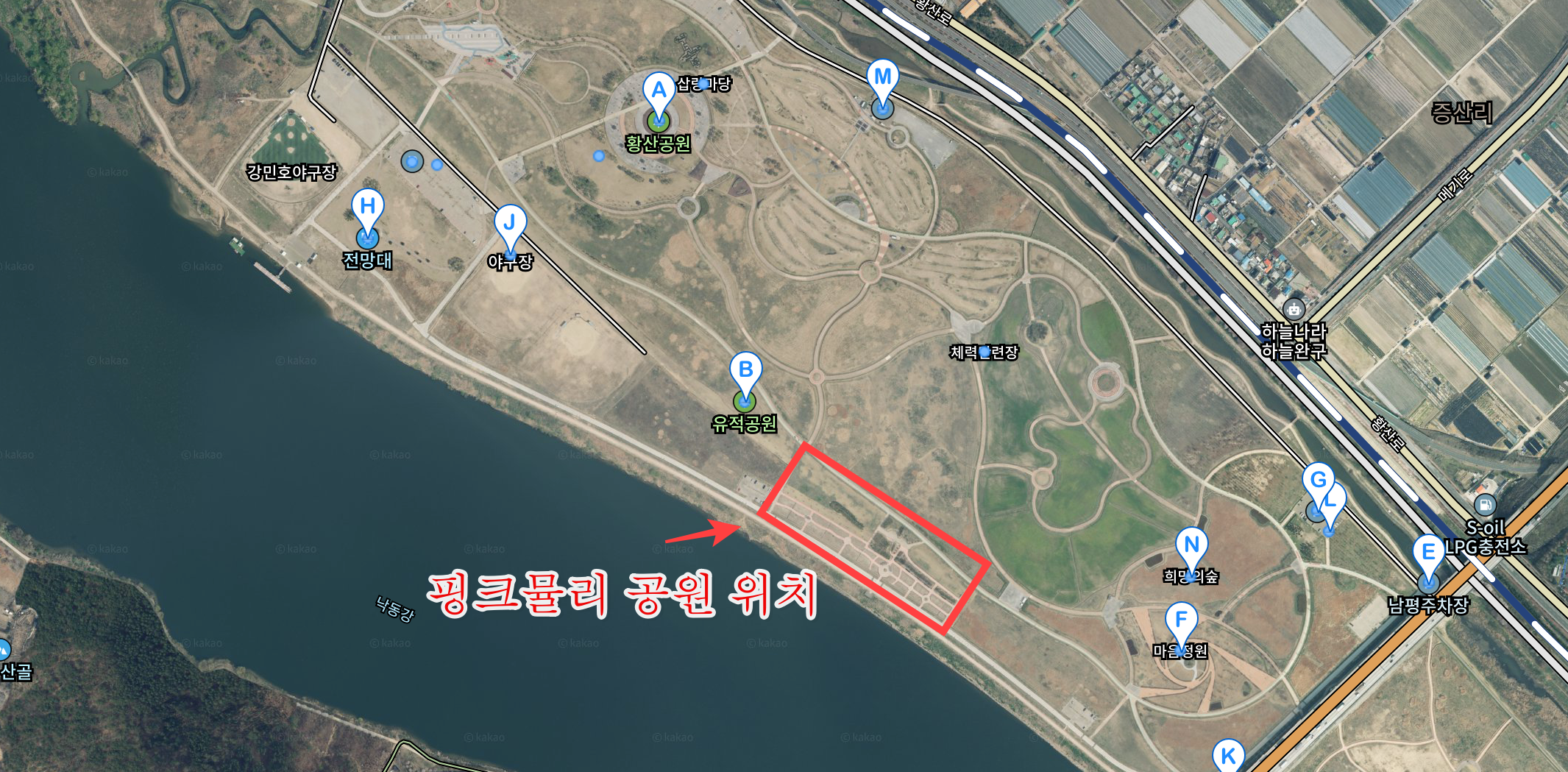핑크뮬리로 이뤄진 곳은 황산공원 내에서 강가 쪽에 위치하고 있습니다. 공원 입구 주차장에 주차 후 운동 겸 경치를 구경하며 가셔도 되고 핑크뮬리 위치 옆 주차장이 몇 군데 있어 그곳에 주차 후 관람하셔도 됩니다.